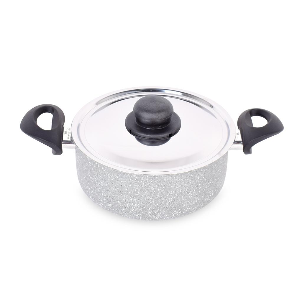 - تصميم مكون من 3 طبقات:هذه القدور والمقالي المغطاة بطبقة من الجرانيت مصنوعة من الألومنيوم من أجل الحصول على توزيع متساوى للحرارة.